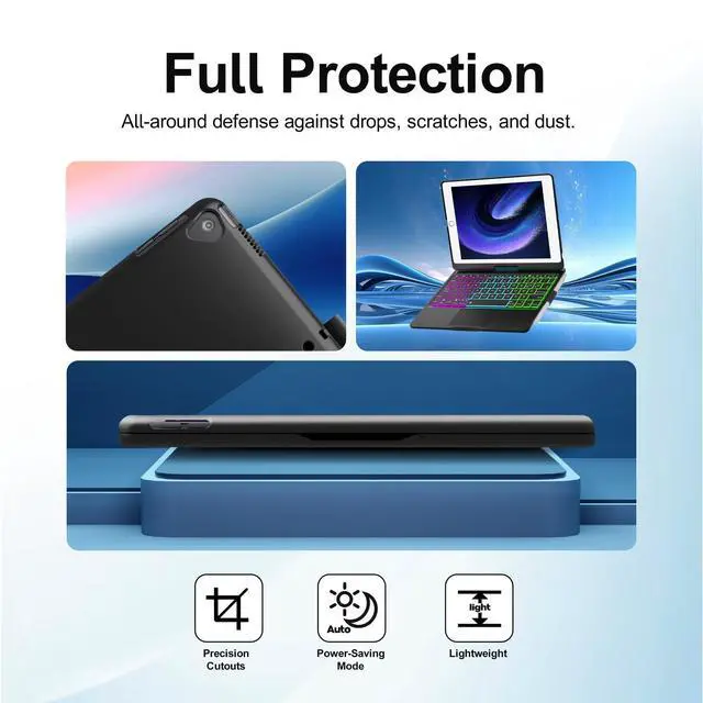 Power Saving: iPad 7th generation case with keyboard provides superior protection with premium hardshell design, ensuring all-around defense against drops, scratches, and dust. Precision cutouts provide full access to all ports. The lightweight design makes it portable. iPad 9th generation keyboard automatically enters power-saving mode when closed, extending standby time ^^