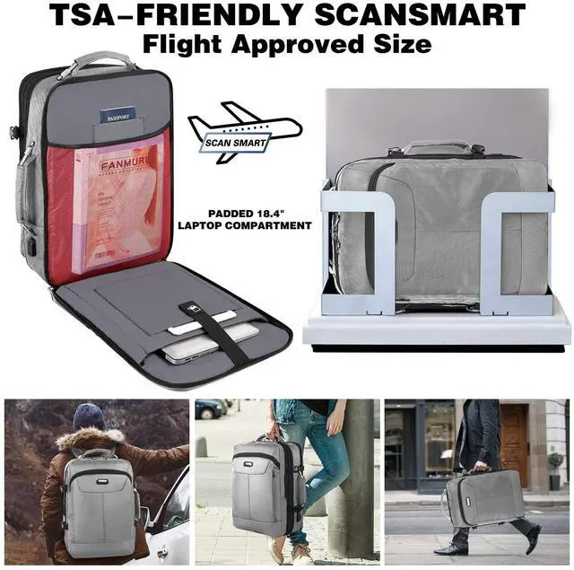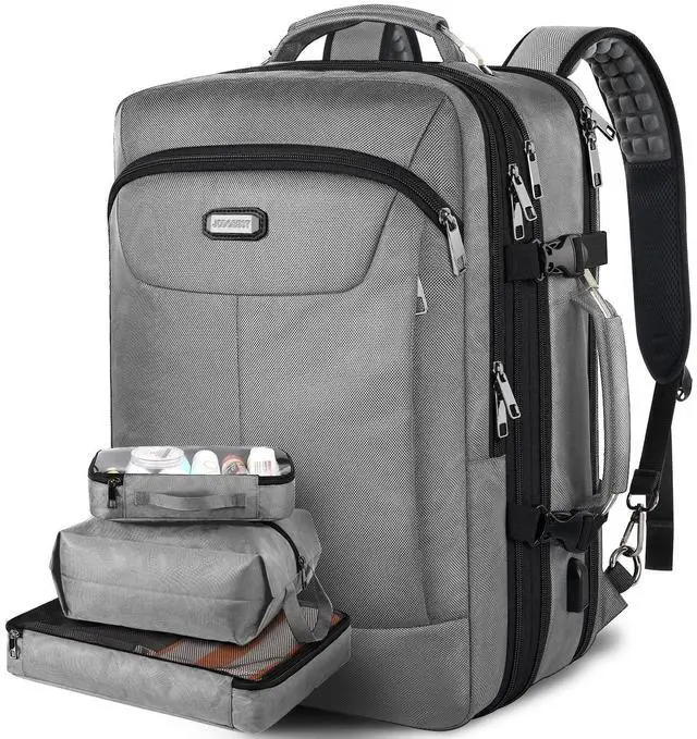 Expandable & Large Capacity: This extra large travel backpack with expandable feature offers you more packing capacity. Unzipping to get 45L storage then you can easily hold 3-7days travel gear. It fits overhead and under seat while on state of standard carry on size, is ideal for men, women, weekend traveler, or occasional vacationer. This versatile luggage backpack also meets airline carry-on requirements, for airlines such as Easy Jet, Spirit, Jet Blue. ^^ USB Charging Port & Side Pocket: Made of Water Resistant Polyester Fabric and anti-scratch material, ensure a secure & long-lasting usage. Many hidden pockets can accommodate lots of travel accessories, toiletries, side Zipper pocket for Easy access essentials, external USB port with set-in charging cable offer convenient charging your cellphone and other electronic devices. It's the best gift for Mother's Day, Father's Day, and also the best travel gift for girlfriend, wife, daughter, friends. ^^ Convertible Design & Easy to