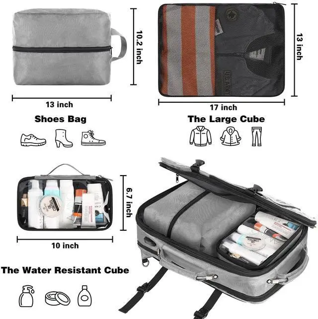 Organize: Large cube for clothes, Medium cube for shoes, Small water resistant cube with transparent side for providing clear overview of toiletries. 2 front compartment with various pockets for storing notebooks, pens, keys and other small items. Main compartment with separate mesh pocket and roomy space to store different travel gears, internal compression elastic straps offer well protection for everything. An anti-theft back pocket is suitable for valuables.