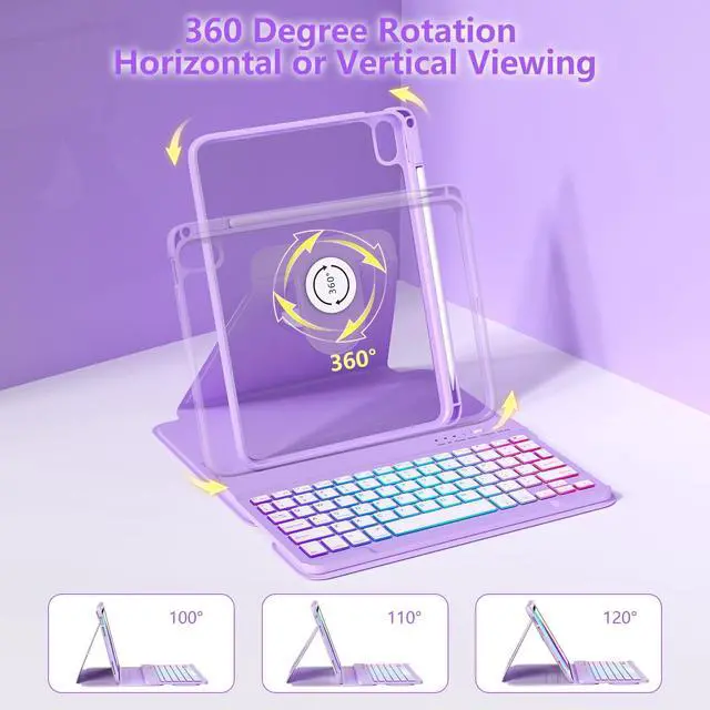 WORK & PLAY ANYWHERE: This ipad 11th generation case with keyboard can rotate 360 degrees. You can let it stand horizontally when working or browsing the web, and you can let it stand vertically when reading or watching short videos. There are 2 anti-slip grooves on the case, which can be adjusted vertically or horizontally to the appropriate angle, making it convenient for you to work, read, draw and entertain in other environments ^^ 7-COLOR RGB BACKLIGHT +