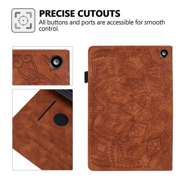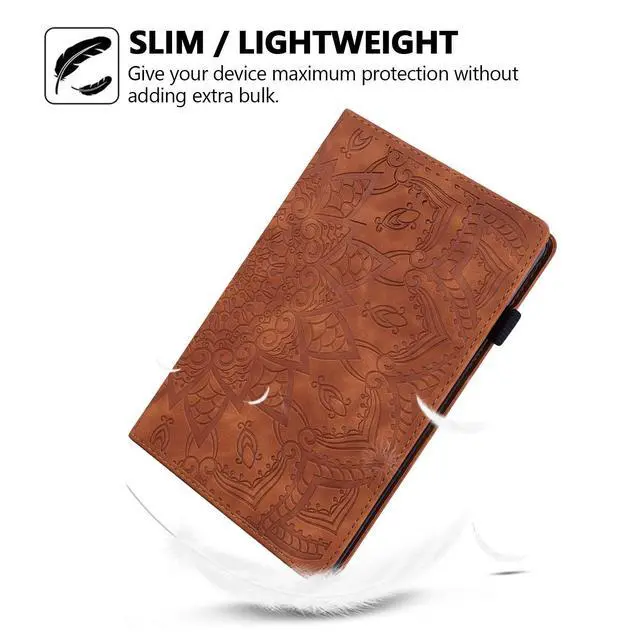 Features: - Pretty mandala flower embossed surface, offers exquisite and attractive look for your tablet. - Easy access to all features and controls (camera, charging port, volume button, etc) without removing the case. - Elastic strap closure ensures cover securely closed, double fixing your device when fold the front cover backward for reading. - Front-to-back protective cover case give a full protection for your tablet against dust, water, fingerprints, scratches, shocks and bumps. - It can be used as a stand with adjustable horizontal position that allows you to view it easily when it is placed on a desk. - Interior with 2 card holders for carrying your ID/ credit cards/ business cards/ photos. - Side with an elastic loop holder for stylus.