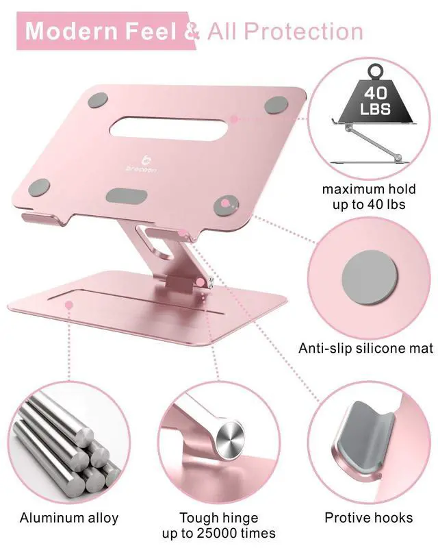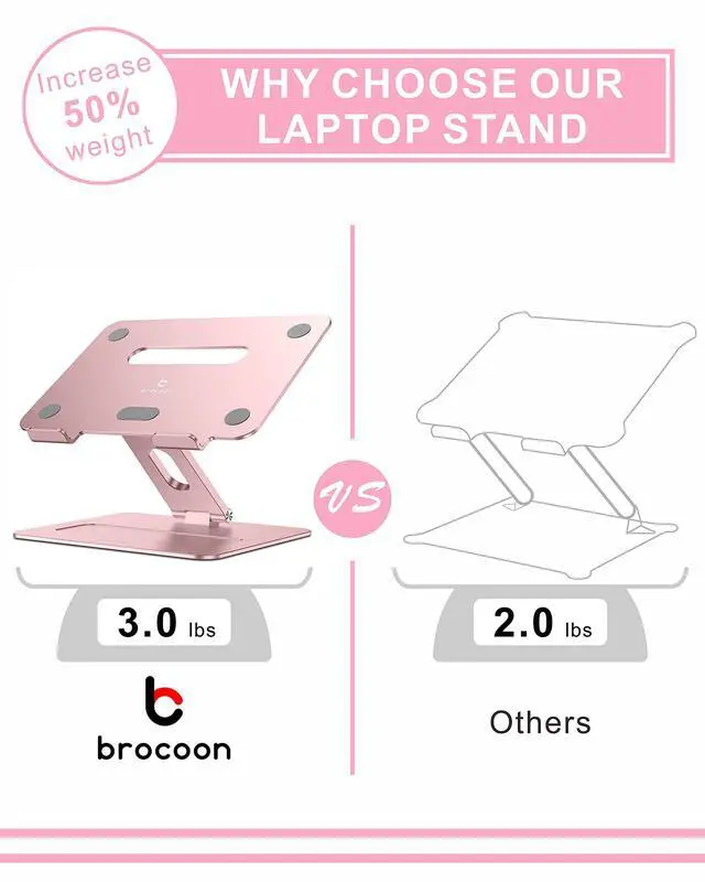 You: Brocoon macbook stand for desk comes with a variety of adjustable height and angle. This computer stand with ergonomic design can help you set up with the top of the screen at eye level and can prevent muscle fatigue and tension, eye strain and stay back pain-free, leading to fewer missed workdays and more productivity during work times. Laptop holder gives more flexibility in setting your workspace up to suit your requirements.
