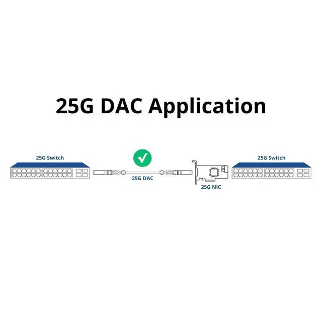 25Gbps, 25GBASE-CR SFP28 to SFP28, Passive, Direct Attach Copper Twinax Cable, 30AWG. The length of the cable includes the connectors at both ends. ^^ Compatible with Cisco, Meraki, Ubiquiti, Mikrotik, Arista, Netgear, D-Link, Supermicro, TP-Link, Quanta, Solarflare, PaloAlto, F5 and more brands ^^ All products are passed by TDR & VNA tests in our Signal Integrity Lab ^^ Widely used in data centers, storage area networks, Network Attached Storage, high performance computing, 5G Wireless, etc ^^ 30 days free-returned, exclusive FREE 3-year warranty and free lifetime technical support