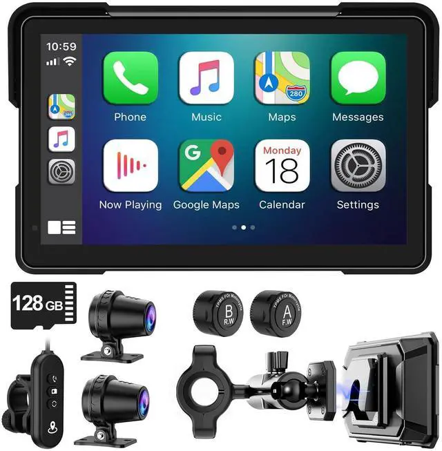 This feature, combined with its ability to serve as a motorcycle CarPlay with camera, ensures important moments are always preserved for safety and evidence. ^^ Wired Control & Voice ControlEnhance your riding experience with seamless CarPlay integration, software navigation for optimal routing, and voice commands for hands-free operation. The included wired controller lets you safely take photos, switch camera views, and manage calls without distracting from the road. ^^ Sensor LightFancyTiger's intelligent light sensor automatically adjusts screen brightness based on ambient conditions, reducing eye strain and ensuring optimal visibility of navigation and information during day or night riding. ^^ Motorcycle DVR with Dual CamerasThis 7-inch motorcycle CarPlay unit includes front and rear 1080P dashcams that support split-screen display while simultaneously recording your journey. The package includes a 128GB SD card for loop recording and G-sensor functionality. With built-in WiFi, you can view, play, and download footage directly to your smartphone in real time.