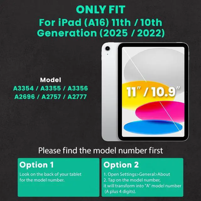 Compatibility: Only fits for iPad (A16) 11th/10th generation (2025/2022, 11/ 10.9 ), Model: A2696, A2757, A2777; please double check the model number on the back of tablet (A****) before purchase.