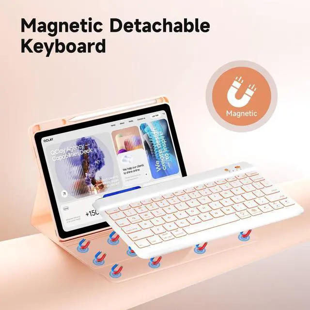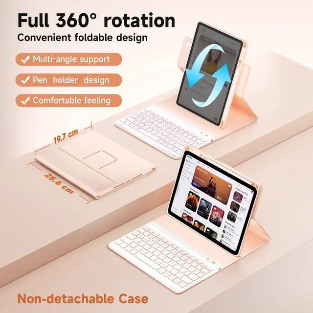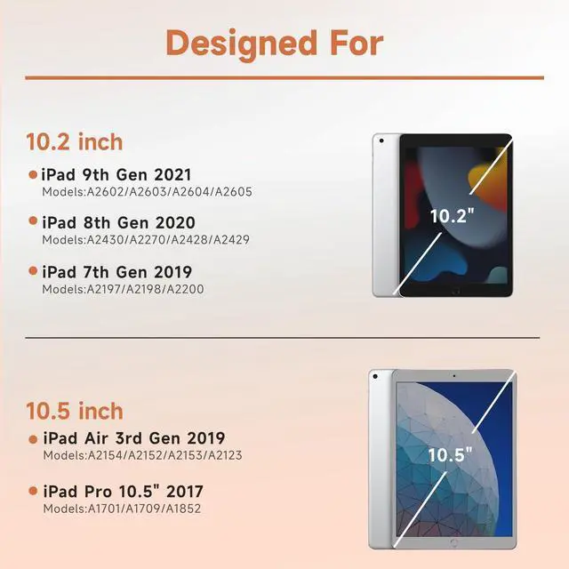 Generation 2021 (Model number: A2602/A2603/ A2604/ A2605), 8th 2020 released (A2430/A2270/ A2428/ A2429), iPad 7th Gen 10.2 inch 2019 released (A2197/A2198/A2200), iPad Air 3 10.5" 2019 released (A2152/A2123/A2153/A2154) and iPad Pro 10.5 inch 2017 released (A1701/A1709/A1852). It's Not compatible with any other devices. Please check the model number of your iPad back bottom. ^^ 360 Rotatable with Multiple Viewing AnglesThe 360 rotatable design provides you with horizontal and vertical viewing angles. The non-slip inside cloth and detachable keyboard allow you to adjust the screen vision and typing position at will. You can type, sketch, view and read anywhere. ^^ Upper Pencil Holder & Full ProtectionThe upper pencil holder allows you to place your pen and you can easily remove the pen with one hand. The all-inclusive design and corner protection can protect your iPad well. And the honeycomb grid inner layer cushion can prevent your device from overheating to extend its life. ^^ Rechargeable Backlit Keyboard7-color backlit and wireless keyboard allows you to type comfortably even in low light conditions. Shortcut keys make it easier for you to use your device. Use a USB-C charging cable to ensure long-term use.