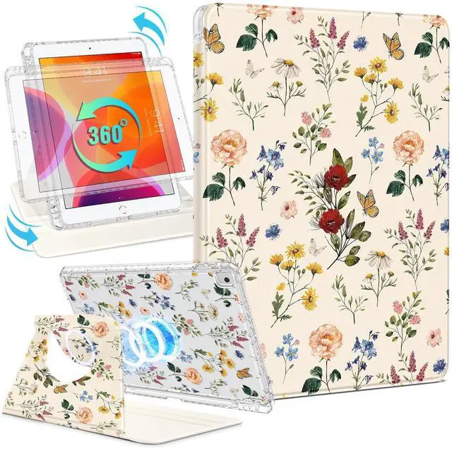 Shorogyt for iPad 9th/8th/7th Generation 10.2 Inch Case Magnetic Stand for Women - Cute Design 360 Degree Rotating Covers Girls Kids with Pencil Holder for Apple i Pad 9/8/7 Gen,Retro Flower