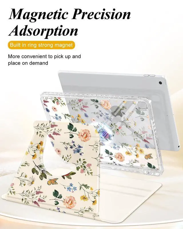 Strong Magnetic: This rotating case suitable for iPad 7th/8th/9th generation with a detachable magnetic cover and has strong magnetic attraction. It can be used as a stand or removed for individual use, making it very stylish and convenient ^^ 360Rotate: The cute 360 degrees rotating case for i Pad 9/8/7 generation 10.2 inch allows you to flexible adjust the tablet to multiple angles freely. 2 non-slip grooves able to set up multiple horizontal stand angles for viewing or typing ^^