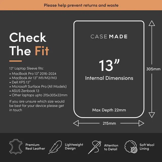 Fits: MacBook Pro 13 2016-2024 // MacBook Air 13 M1/M2/M3/M4 // Dell XPS 13 // Microsoft Surface Pro (All Models) // ASUS Zenbook 13 // Other laptops (See internal dimensions)