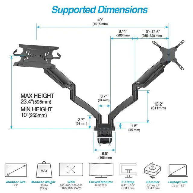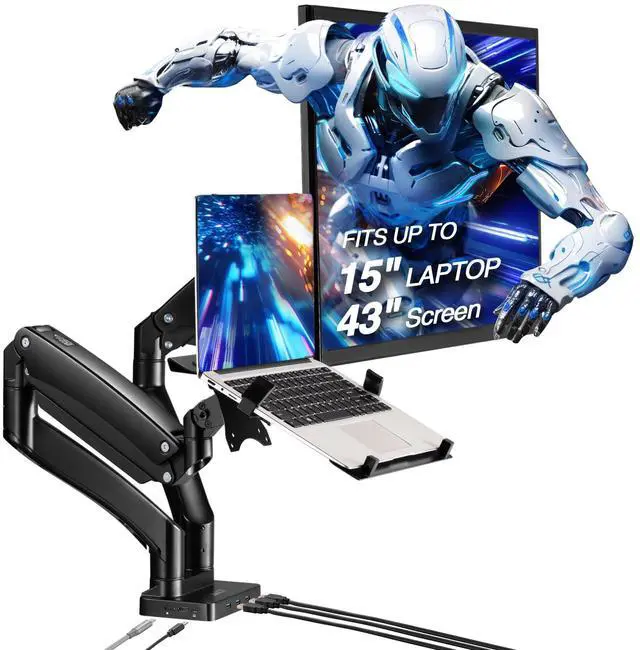Dual Display Extension - Enhance productivity with improved multitasking capabilities through dual display extension, allowing you to work with up to three monitors simultaneously (laptop and two external monitors). ^^ Attachable Laptop Tray - Versatile and adaptable. Use either as a dual monitor mount, or as a single monitor mount with a laptop holder to accommodate your laptop, tablet, or keyboard, providing you with optimal flexibility and functionality. ^^ Note - If your laptop still sits higher than what you'd like, consider using our VESA Extension Plate (AVLT-MT57-1) to lower the placement of the VESA laptop tray.