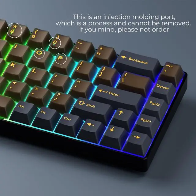 RGB effect (Notes: Because of the semi-transparent outer layer, Some keycaps have a light leakage design, which is a production process requitment, not a quality problem, If you mind, please do not place an order. ^^ Cherry ProfileCherry profile keycaps are shorter and flatter than OEM or SA profiles, offering a comfortable typing experience with a slightly stepped design. ^^ Wide CompatibilityThis 216 keys keycap set consists of 108 standard keys and comes with plenty of supplementary keys that you can use them to build keyboards according to your ideas, the keycap set compatible with 60%/65%/75%/80%/96%/1800/100% ANSI US and ISO UK layout mechanical keyboards with MX-stem(cross-shaped) swithes, additionally, the keycap sizes for the spacebar include 6.25 u and 7u and other size spacebar for alice keyboard. ^^ What You GetIncluding 216 keys keycaps, packed in a great keycap-specific storage box that can be used to store your idle keycaps for a long time, Not include keyboard, the keyboard is just for demo not included.