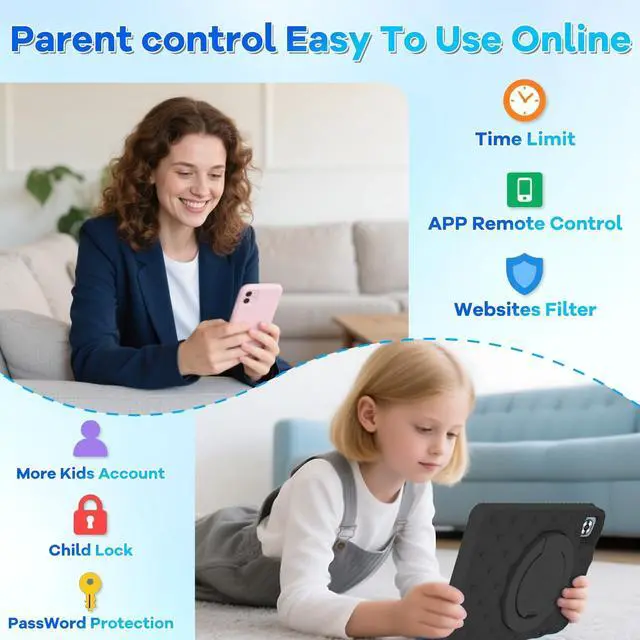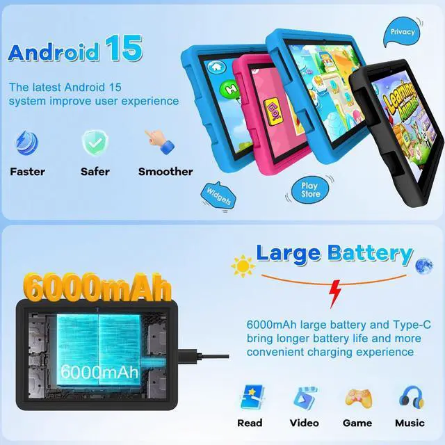 & Powerful Performance: DMOAO Kids Tablet runs on the newest Android 15 OS, delivering a safer, faster, and ad-free experience tailored for kids. Powered by an octa-core processor and 30GB RAM (8GB physical + 22GB virtual expandable), it handles learning apps, games, and videos smoothlyno lag during multitasking. Plus, 64GB built-in storage (expandable to 1TB via microSD) lets your child store all their favorite content. ^^ All-Day Battery, Dual Cameras & Drop-Proof EVA Case: A strong 6000mAh battery provides hours of non-stop learning/entertainment (perfect for trips or school). Capture fun moments or video chat with family using the 5MP front + 8MP rear cameras. The tablet is wrapped in a protective, non-toxic EVA shell (with excellent wear/impact resistance) to shield against drops and scratches. ^^ Intelligent Parental Controls & Preloaded Educational Apps: Create a safe digital space with the robust Parental Control Centereasily manage screen time, curate approved apps, and monitor your childs activity. It also comes pre-loaded with a suite of educational apps, turning screen time into productive learning right out of the box. ^^ 10.1 Anti-Blue Light HD Screen & Hands-Free Stand: The 10.1 -inch HD screen (1280*800 resolution, fully-in-cell tech) offers a clear, wide viewing angle for videos/e-books. Its anti-blue light design + automatic brightness adjustment protects kids eyesight. The case has a hidden adjustable standprop it firmly on a table for hands-free movie watching or learning, with flexible angle adjustments. ^^ Next-Gen WiFi 6 ( 2.4G +5G)