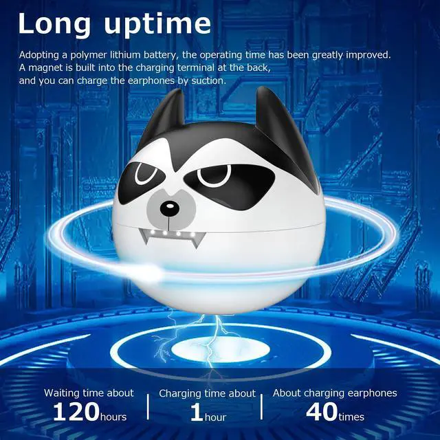 Child: Our small wireless earbuds was inspired by the round ball and the lovely image of panda. The cute Husky cartoon appearance and high fidelity sound quality makes it the best gift for children at Christmas, Halloween, New Year, birthday, Easter