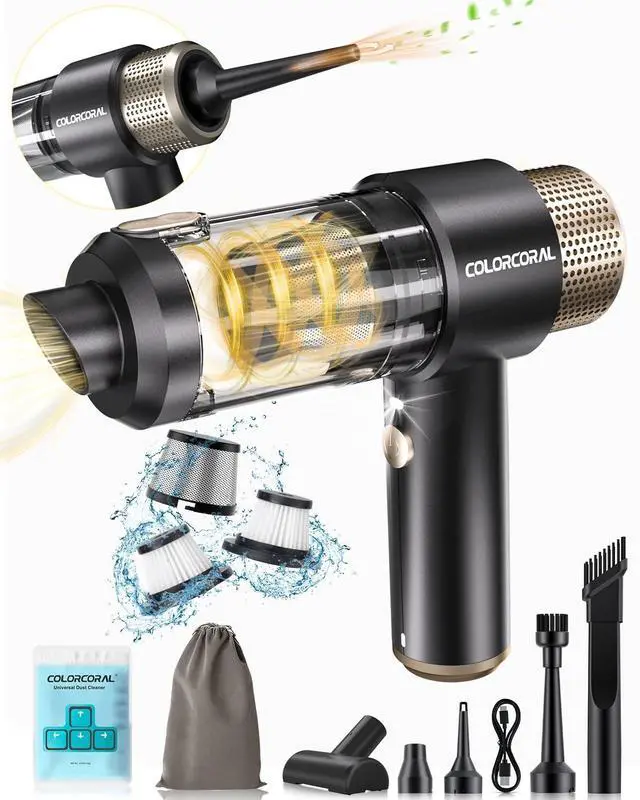 COLORCORAL handheld vacuum is equipped with vacuuming, blowing, inflating and pumping, multi-functional design makes cleaning more efficient. With different brush heads, nozzle and Two Pack Cleaning Gel ^^ This universal dust cleaner is made of natural gel, no sticky to hands, smells sweet with lemon fragrance, no stimulation to skin ^^ Make sure your hands are dry and clean, take a piece of the cleaning gel, knead it into a ball, press the cleaning gel slowly into the keyboard, car vent and rugged surface and then pull out, the dust would be carried away with the cleaning gel ^^ The Keyboard cleaner vacuum comes with a Type-C charging cable, so you can charge it at any time, whether you're at home, in the car or outdoors.
