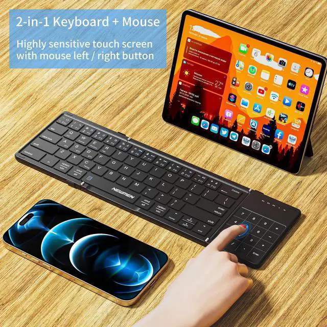 Size Wireless Keyboard: In addition to the standard sized QWERTY layout, this full size keyboard also supports multi touch and mouse functions. when you are viewing content, the wireless keyboard with touchpad supports gestures such as single click, zoom in/out, double click, etc. Choosing foldable bluetooth keyboard with touchpad and numeric keypad greatly improves your work efficiency. ^^ Mini and Portable