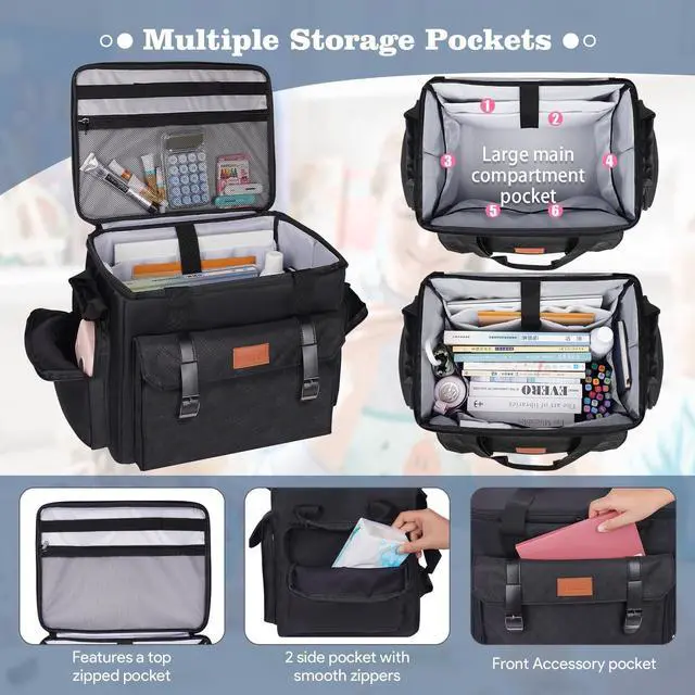 DescriptionLarge capacity and multiple storage, the large main compartment of this teacher laptop bag with 4 inner pockets could easily hold all your daily necessities/college supplies/teaching materials/medical supplies in an organized way.