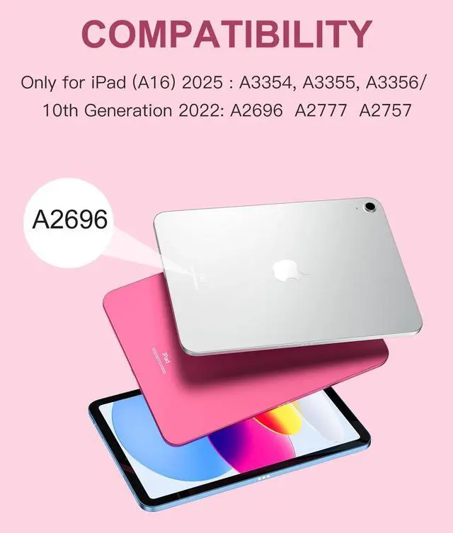 • CompatibilityFor iPad (A16) 11th generation 11-inch 2025 (Model: A3354/A3355/A3356), For iPad 10th generation 10.9-inch 2022 (Model: A2696/A2757/A2777). Not for any other models. Please check the model number No. "AXXXX" the bottom of the back of your tablet to confirm correct size before purchasing