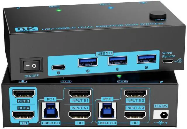 KVM Switch]: 2 PCs 2 monitors HDMI KVM switch Features 1 USB-C and 3 USB 3.0 ports for connecting peripherals such as keyboard, mouse, scanner, printer, USB camera, and hard drive ect. 5Gbps transfer rate is faster and more stable than