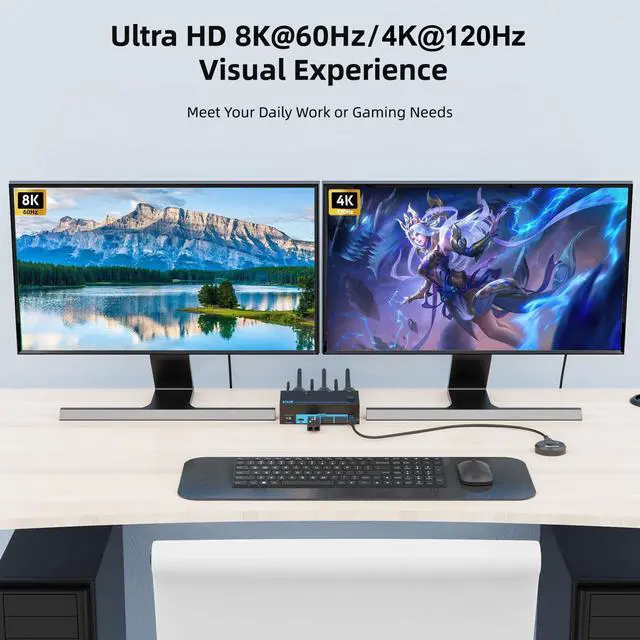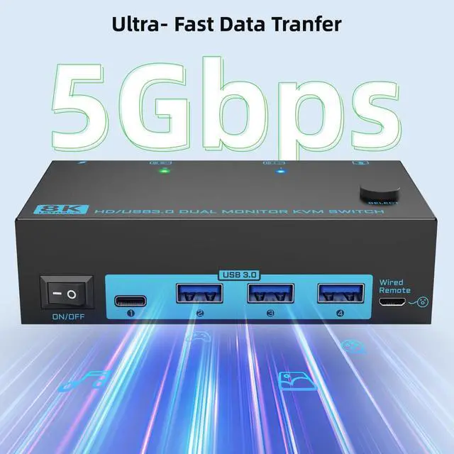 Ultra HD Enjoyment]: 8K 2 monitors KVM switch dual monitor supports resolutions up to 8K@60Hz/4K@120Hz for vivid and clear visuals. Just Plug and Play, No complex software or drivers required. It's perfect for Gaming player to enjoy smooth and lag-free gaming experience at 120Hz refresh rate.: Please use standard HDMI 2.1 cable within 1.5M to reach the max resolution ^^ [5Gbps USB 3.0 HDMI 2.1