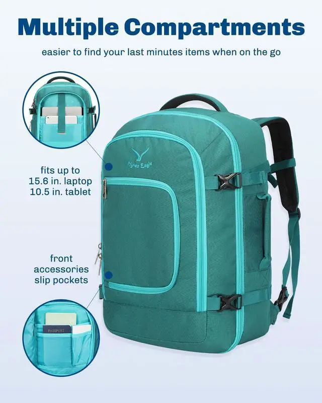 Weight: 2.2 lbs/ 1 kg ^^ Pass Through Luggage Strapcarry on backpack is designed with an added back trolley strap for more convenient, you can quicker attach the travel cabin backpack to the luggage handle and move more easily around the airport or wherever you go; 4 compression straps help eliminate extra backpack space, making the carry on bag more compact, it can also relieve the pressure on the zippers, so if travel with a partially packed bag, you can preventing the contents from sloshing around ^^ Wet Compartmenttravel backpack for men and women features a new PEVA-lined waterproof compartment instead of a mesh zip compartment, provides a dedicated place to put away your wet clothes or toiletry items, from damp towel to beach flip flops ^^ Padded Sleeve for 15.6 -inchThe middle zip compartment is built with a padded laptop sleeve that fits up to a 15.6 -inch and a padded tablet sleeve that fits up to a 10.5 -inch; backpack for travelling designed with front zip compartment can organize you last minutes accessories, tickets or brochure, inside with 3 slip pockets, keep essetials in place and at the ready, main compartment with fasten buckle straps which is roomy enough to pack travel belongings, from organizer cubes to toiletry bag ^^ Comfortable to Carryhide-away contoured travel weekend backpack straps are well padded with air mesh, can carry it comfortably as a carry on backpack or also can easy convert it into a travel duffel bag; provide 4 carrying options for travelers' multiple alternatives; there is 1 sternum strap that adjusts lengthwise and slides up and down the shoulder straps, and 1 adjustable waist strap designs for stabilization and carry comfort ^^ Versatile for Occasionspack it as travel backpack when you plan to have a weekend out or overnight trip, tuck the laptop and documents quickly for next day business visit, slip travel backpack over the upright handle of wheeled luggage seamless when you are tired to carry it on your back, a multiple functional travel must have for women and men