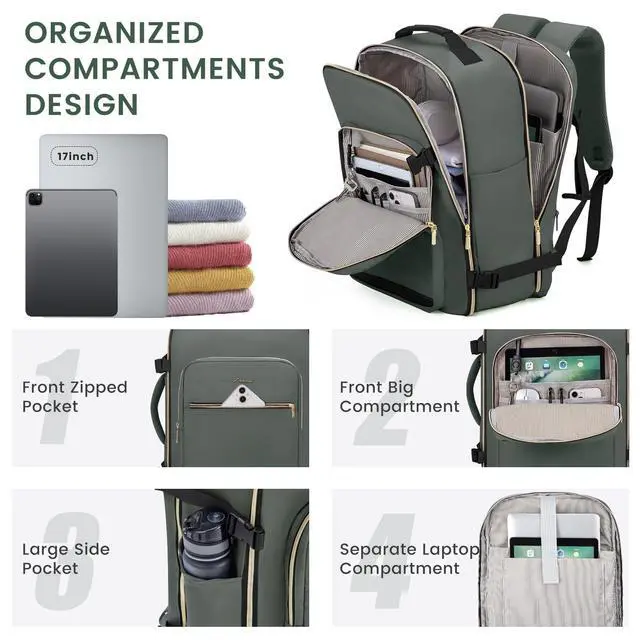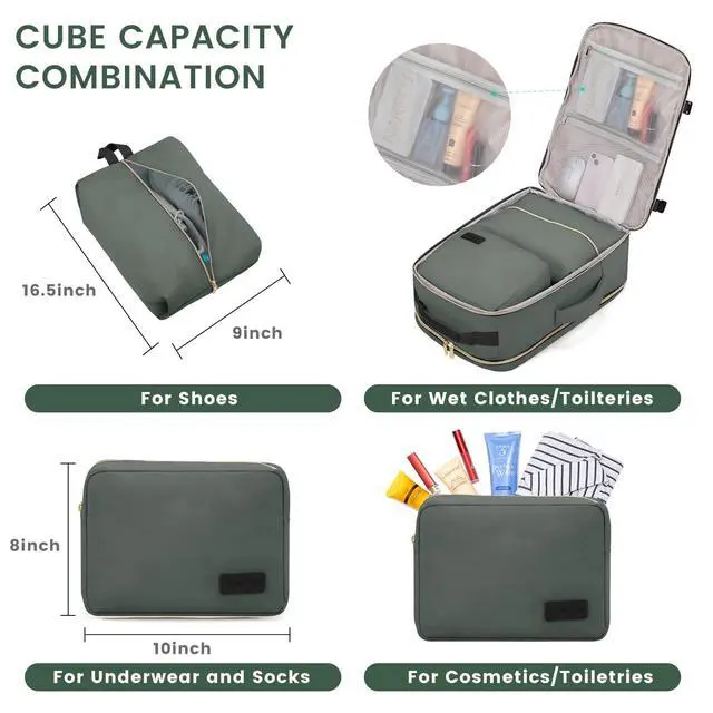The side straps can also help you compress the pack when it is too full. ^^ BACKPACK FOR TRAVELING ON AIRPLANESWith an 18*14*8 inches size, this travel backpack meets the standard of personal item bags of airlines. It can be put on the luggage set and under the seat easily. The luggage strap on the back of the backpack allows it to be stably attached to a suitcase. ^^ WELL-DESIGNED COMPARTMENTSThis travel backpack has 4 main compartments and 3 packing cubes supplied, which enable you to keep your things in order. Your shoes, toiletries, and underwear can be placed in separate packing cubes.