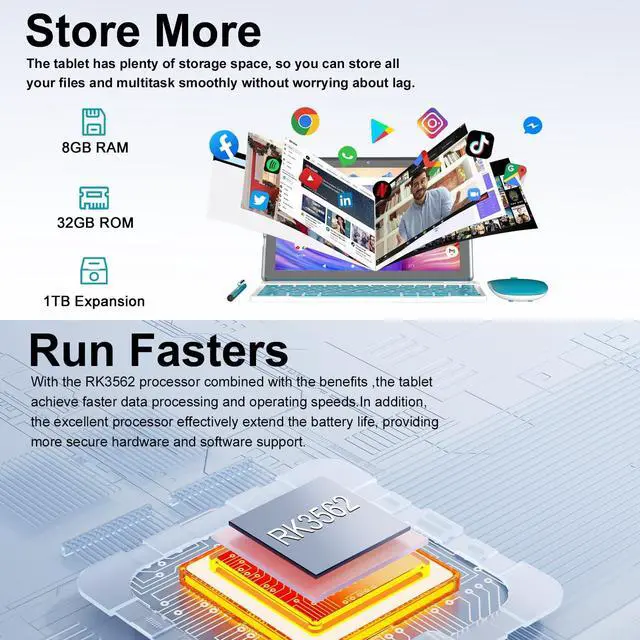 8GB RAM+32GB ROM+1TB Expandable Our android 15 tablet PC built-in a powerful storage combination of 8GB RAM ( 4GB + 4GB achieved through expansion technology ) and 32GB ROM, comes with new generation ultra-high performance and low power consumption 2.0GHz Processor, achieve faster and more stable running and storage speeds. In addition, it can be expanded up to 1TB with a microSD card (card not included) for even more storage.