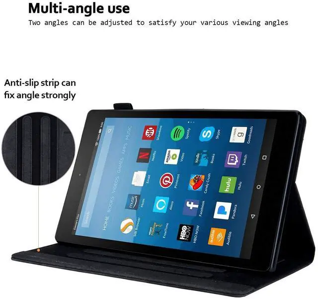 Compatible with Model: - Kindle Fire HD 8 Tablet ( 8th Generation, 2018 Release )- Kindle Fire HD 8 Tablet ( 7th Generation, 2017 Release )- Kindle Fire HD 8 Tablet ( 6th Generation, 2016 Release )( Will Not fit any other model, pls kindly check your tablet before purchasing )Features: 1) Premium synthetic leather exterior & soft flexible TPU interior, gives full protection and easy installation. 2) Interior multiple card slots to manage a variety of cards for you while on the go. 3) Designed with an elastic pencil loop, convenient for keeping your stylus pen at hand. 4) Built-in anti-slip stripes allow you to set up multiple horizontal stand angles and enjoy your contents hands-free. 5) Support auto wake & sleep feature, open the case for wake & close for sleep, preserving battery life of your tablet. 6) Precise cut-outs and openings, easy access to all buttons and holes without removing the protective case. 7) Strong magnet flip case, keeps the front cover sealed. Ideal for home, office and travel.