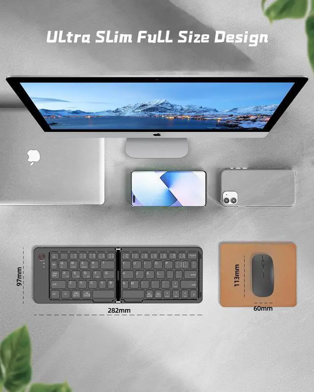 Devices: The Bluetooth keyboard and mouse set can connect to three different devices simultaneously through its triple Bluetooth channels. The wireless mouse supports both Bluetooth and 2.4GH z USB dongle connections. With newly upgraded Bluetooth technology, enjoy faster link speeds. Easily switch between devices by clicking the mode switch button. This versatile, portable set is compatible with macOS, iPad, iOS, Windows, and Android operating systems. The foldable design of the keyboard and the compact, folding mouse make it ideal for on-the-go use. ^^ Portable Keyboard