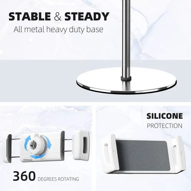 ^^ Wide Compatibility: Fits all 4.7" - 12.9" smartphones and tablets, including iPads (Pro 12.9 / 9.7, Air, Mini, 5th-10th Gen), iPhones, Kindle e-readers, Nintendo Switch, Galaxy Tab, and Fire tablets. Adjustable clamp ( 4.7" - 9.8" ) ensures a snug fit. ^^ Flexible Height & 360