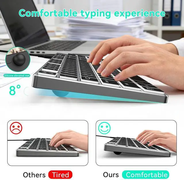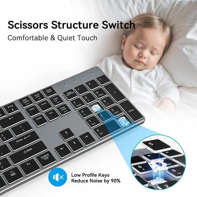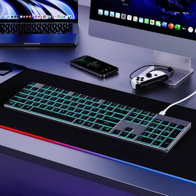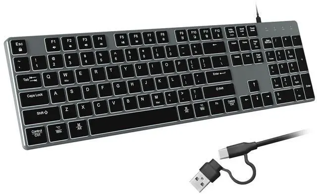 Dual USB-C & USB-A Wired Keyboard for Mac/Windows Experience universal compatibility with this full size wired keyboard, featuring both USB-C and USB-A connectors. It offers true plug-and-play convenience for iMac, MacBook, Windows PCs, and Android devicesno drivers required. ^^ Ultra-Slim Full Size Keyboard with Numeric Pad Crafted from premium aluminum alloy, this ultra-slim USB C keyboard boasts a sleek 13.8 mm profile. The full size keyboard layout includes a dedicated numeric pad, engineered for efficiency in data entry, coding, office tasks, and gaming. ^^ Ultra Silent Full Size Keyboard with 19-Key Anti-Ghosting This ultra silent full size keyboard features responsive scissor switches, reducing 90% of typing noiseideal for offices or late-night sessions.