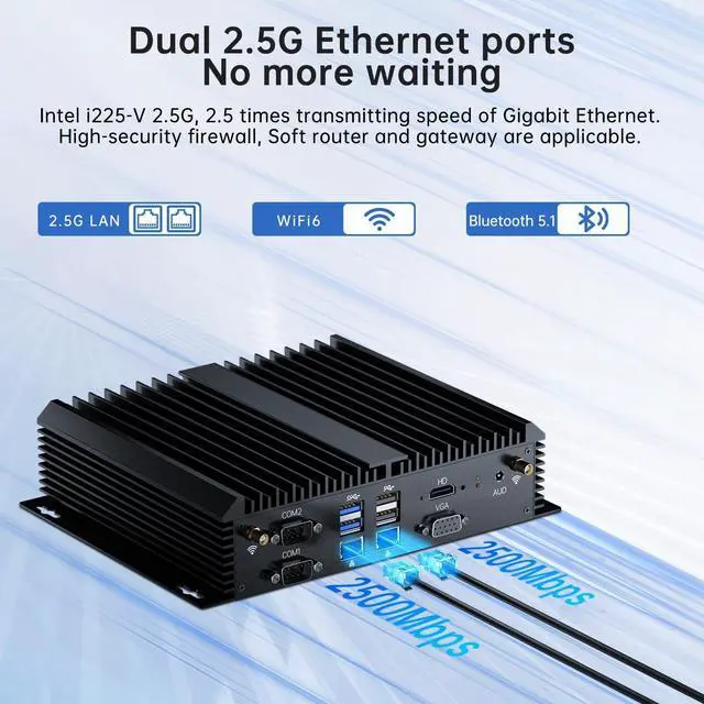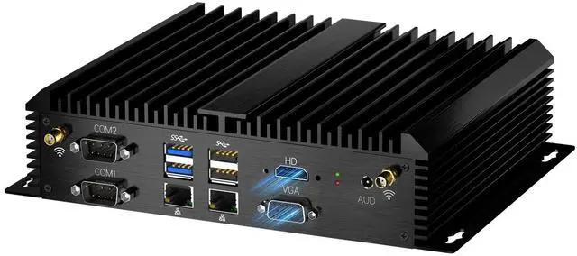 and It can give you an immersive, lifelike picture quality experience, more efficient, comfortable productivity. It can work in harsh environments. Full metal case help conduct heat. ^^ [Fanless Design & Ports] 4xUSB 3.2 (10Gbs/s), 4xUSB 2.0, 6xCOM RS232, 2x 2.5G RJ-45 LAN ports, 1xHDMI port, 1xVGA port. Mini PC with metal casing fully enclosed fanless passive cooling design, with low power consumption, dustproof, zero noise, anti-vibration, strong anti-interference, High compatibility ability, 24 hours of stable operation in harsh environments.