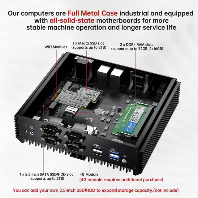 [High Performance] Mini PC equipped with core i7-1165G7 processor, 4 Cores 8 Threads, 12 MB Smart Cache, Base Frequency 2.8GH z(Max 4.7GH z), Pre-installed with Windows 11 Pro (64bit), Built-in 4G module slot, Ruggedized Fanless PC is ideal for Home Entertainment, Office, Online Education, Industry, etc. Support install pfSense software to get up and running fast. Supports Auto Power On, Network Wakeup, RTC Wakeup, Wake On Lan. ^^ [Can Expand Capacity&Dual 2.5G LAN] Mini computer loaded with 2 x DDR4 slot. Dual channel DDR4 upgradeable to max 32GB (2 x 16GB).
