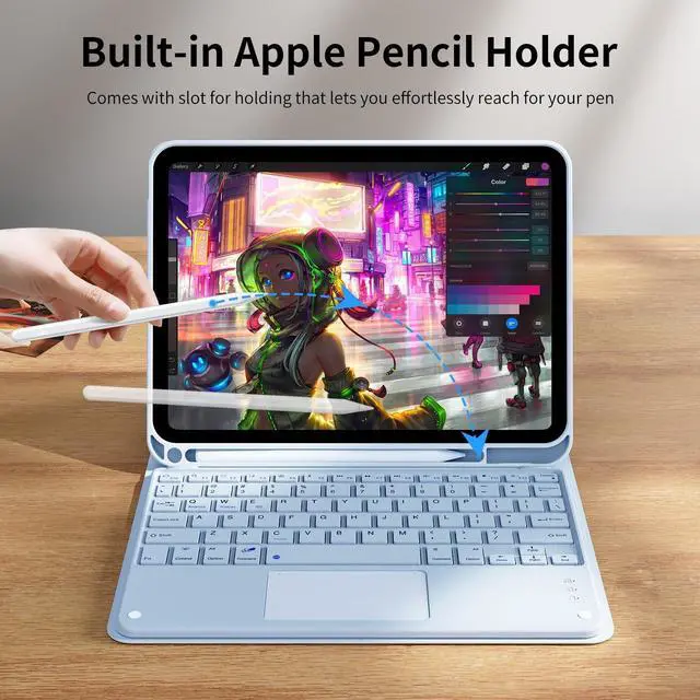 The protective shell can be placed at different tilt angles to adjust the optimal viewing angle, very flexible and user-friendly. ^^ Buit-in Pencil Slot & Sturdy PU MaterialThe ipad 11/10th generation keyboard case has a convenient left side built-in pencil slot that easy to storage and remove your pencil (Apple Pencil is Not included). Premium PU leather cover is waterproof, scratch proof and fingerprint proof, providing full protection for your beloved tablet. ^^ High-Precision Quick Navigation TrackpadThis iPad keyboard case features a responsive and reliable trackpad that allows you quickly navigate your tablet with tap, swipe, scroll and switch apps etc.