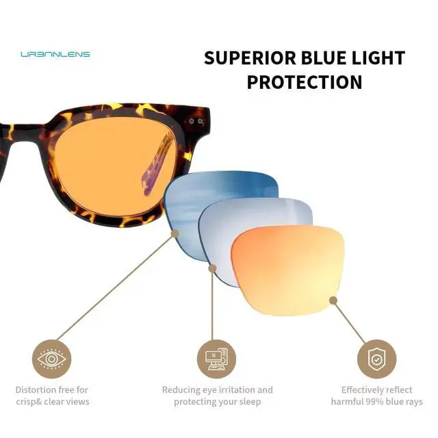 SAFELY USE ELCTRONIC DEVICES: Safely use computers, tablets, and phones after dark without disrupting your sleep quality. ^^ Improved Sleep Quality - Numerous studies have shown that prolonged exposure to blue light can slow or stop the production of melatonin, leading to sleep disorders and an increased risk of damage to the retina, cataracts, and macular degeneration. Our blue light computer glasses incorporate anti-glare high-efficiency blue light filters, reducing eye irritation and protecting your sleep, so you can enjoy your digital age with peace of mind while taking care of your eyes. ^^ Experience Unwavering Confidence and Assurance - With our 365-day unconditional replacement and refund service, you can shop with complete peace of mind. Join the ranks of thousands of delighted customers who have made UrbanLens blue light glasses an indispensable part of their daily routines. Whether at work, enjoying leisure time, or immersing yourself in gaming adventures, these glasses have become trusted companions, providing you with healthier eyes and a life with enriched sleep quality.