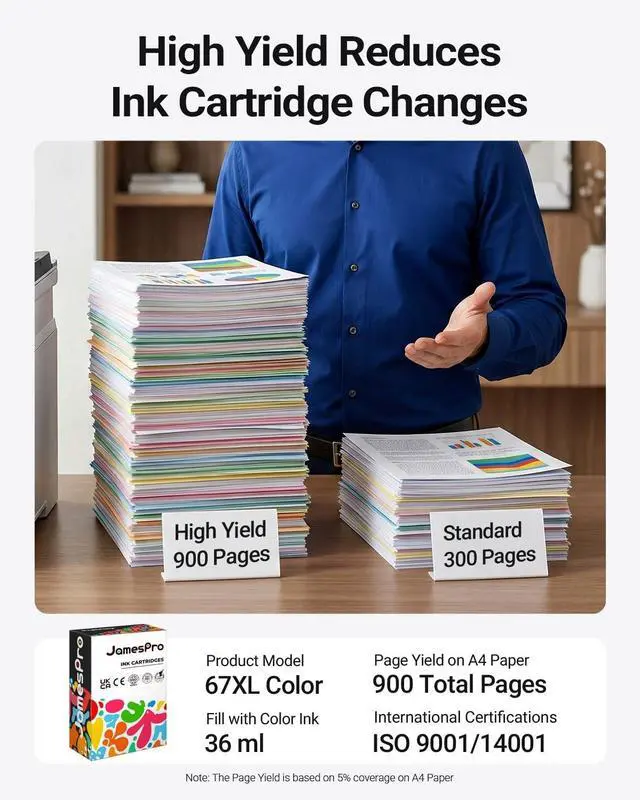 Approx Page Yield: 450 pages per 67xl color ink cartridges, 2 pack 900 pages (at 5% coverage) ^^ Trusted to