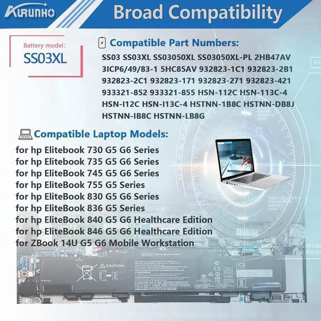 Color: Black. 100% brand New from Manufacturer. ^^ Fits Modelsfor HP EliteBook (730, 735, 740, 745, 830, 836, 840, 846) G5 series, HP EliteBook (735, 745, 830, 840) G6 series, HP ZBook 14U (G5, G6) Mobile Workstation series, HP MT44 Mobile Thin Client series. ^^ Compatible P/NSS03XL, SS03, SS03050XL, SS03050XL-PL. 933321-855, 933321-852, 932823-171, 932823-1C1, 932823-271, 932823-2B1, 932823-2C1, 932823-421. HSN-112C, HSN-113C-4, HSN-I12C, HSN-I13C-4, HSTNN-1B8C, HSTNN-DB8J, HSTNN-IB8C, HSTNN-LB8G. ^^ SecurityALL of our battery is CE, FCC, RoHS Certified. And have passed a series tests of short circuit, overheating, and overload protection before shipments for safety. ^^ AURUNHO After-sales We guarantee 30 days money-back and 12-month warranty; 24 x 7 email support. For any battery questions you fell free to contact us via "Your Orders" tab in your account, we will be glad to help you within 24 hours.