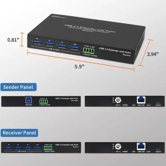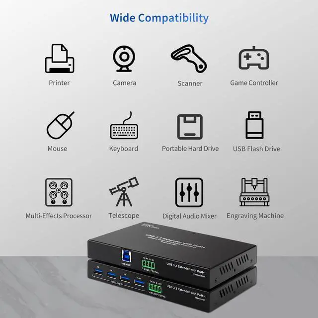 Device Ports: This USB 3.2 & USB 3.0 extender features a built-in 4 USB port in the receiver, allowing connections to multiple USB devices. Utilizing advanced USB data transmission technology, it requires only a single USB tier.
