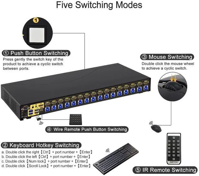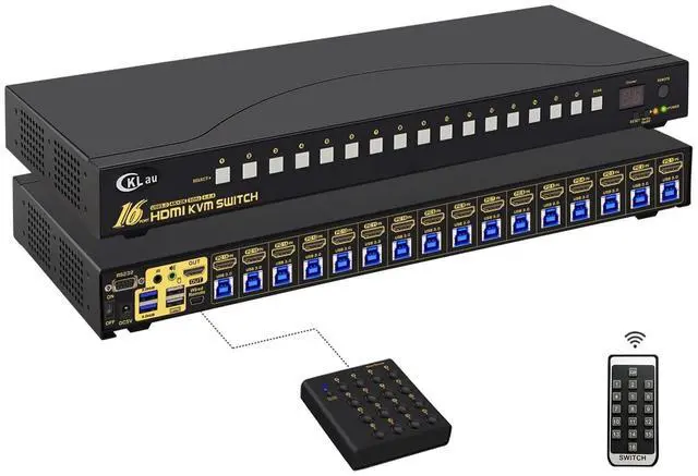 KVM Switch: 16 computers/laptops/DVRs/NVRs sharing one set of keyboard & mouse, audio, 1 monitor and 2 pcs USB 3.0 peripheral device. With all input cables and rack mount hook. Support wired/wireless/unify/gaming/mechanical/Bluetooth/Apple keyboard & mouse, touch screen, OLED screen, 16:9 widescreen, 21:9 ultra-wide monitors, etc. ^^ 2. 16 Port HDMI KVM Switch