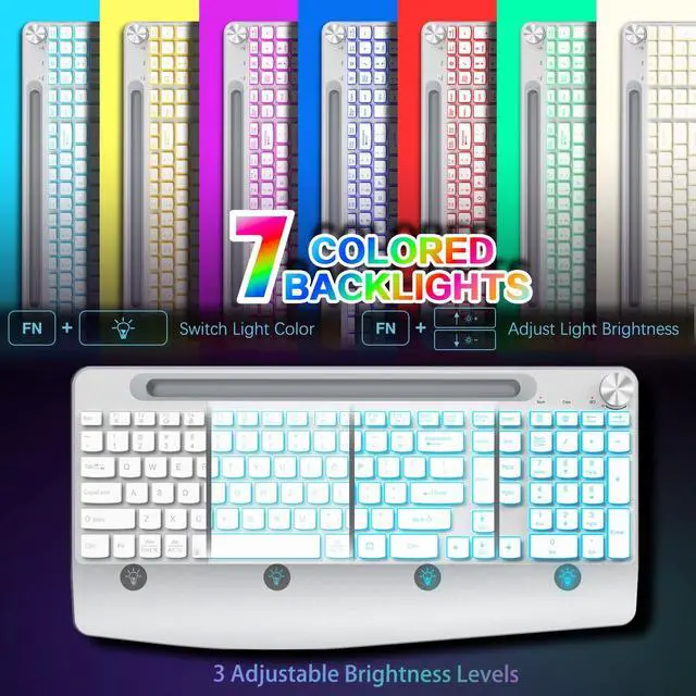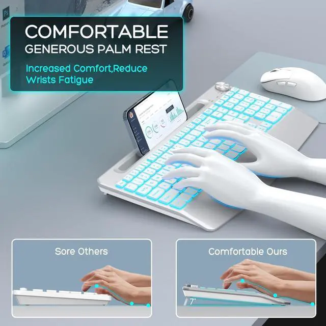 Backlit Keyboard and Mouse WirelessWireless keyboard and mouse set come with 7 switchable backlight options, providing different visual typing experiences. The light up keys make typing at night becomes a breeze. Additionally, the illuminated keyboard and mouse offer three brightness levels (low, mid, high, or off), allowing you to freely adjust the keyboard's brightness or even turn off the LED lights. ^^ Full-Size Keyboard With HolderThe full-size wireless keyboard is designed with a phone and tablet holder. Provides you with additional space to place your phone, tablet, or other gadgetsnever miss anything important messages again.