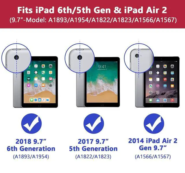 Compatibility: Designed for iPad Air 2 2014(A1566/A1567) / for iPad 6th/5th Generation 9.7 inch 2018/2017(A1893/A1954/A1822/A1823). NOT compatible with any other devices. Please check back bottom of your iPad to find the model number ^^