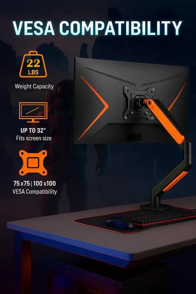 Upgrade your workspace with our premium Single Monitor Gas Spring Monitor Arm, designed to elevate both your productivity and comfort. By mounting your monitor off the desk surface, you free up valuable workspace while creating a clean, organized, and clutter-free environment. This gas spring arm offers smooth, full-range adjustability tilt, swivel, rotate, and extend your monitor with effortless precision. Easily customize your screens position to reduce neck, back, and eye strain, and find the most ergonomic viewing angle whether you're sitting or standing. Built to support monitors up to 32 inches in size and weighing up to 22 lbs, this arm is compatible with most VESA-compliant screens (75x75mm and 100x100mm).