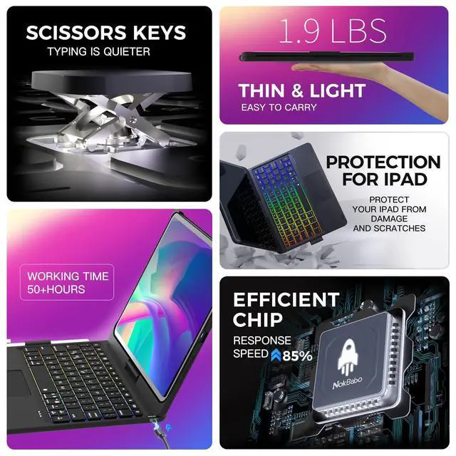 It allows you to control the iPad in a whole new way. Easily edit documents and surf the web, signifcantly boosting your productivity and providing a seamless, convenient operating experience. ^^ 7-Color BacklitThis keyboard for ipad 10th generation features a rainbow backlight. iPad 10th generation case with keyboard has 3 adjustable brightness levels, allowing you to customize the backlight brightness according to your personal preferences and ambient lighting conditions. Whether you're using it in a dimly lit room or a brightly lit space, this feature will provide you with a more enjoyable typing experience when using the 10th gen ipad case with keyboard.