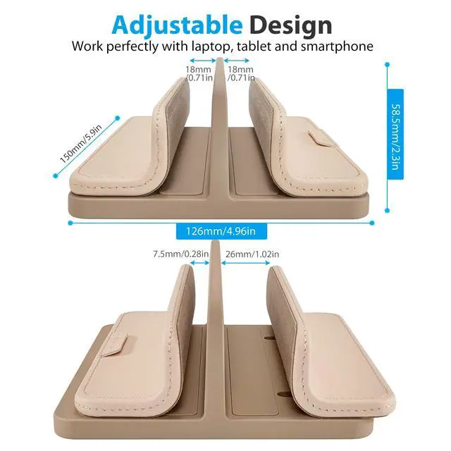 Optimize Desktop Space & OrganizationThis 3 in 1 vertical laptop stand for desk acts as a efficient laptop storage solution. Its dual-slot design cradles two laptops, side guard can be used as an additional phone holder. It efficiently clears your desk space, keeping everything organized and within reach ^^ Widely Compatible 3-in-1 DesignThis multiple laptop holder is incredibly versatile. It accommodates almost any laptop thickness and is also an ideal notebook holder for iPads, phones, and even books, making it laptop stroge solution ^^ Adjustable & Universal FitThe laptop vertical stand features an adjustable width ( 0.71" to 1"), allowing it to function as a perfect laptop holder for desk for most MacBook Pro, MacBook Air, and other notebooks.