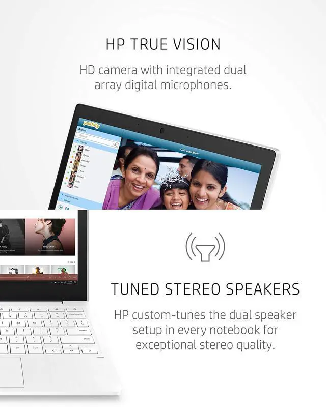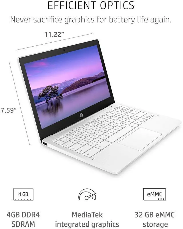 This Snow White HP Chromebook 11a Laptop is light and durable, so you can work or play on the go. It travels well and has a 15 hour and 45 minute battery life, letting you stay connected without having to search for an outlet. Switch between using this laptop for gaming, connecting with friends, and getting your schoolwork done with the powerful MediaTek mobile processor, full-size keyboard, and 11-inch display. Also, Google Chrome and Android apps are all seamlessly integrated on Googles easy-to-use OS. And once youve gotten into your workflow, enjoy the anti-glare, 11-inch laptop screen with high-definition detail of 1 million pixels.