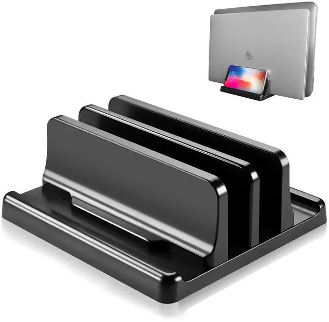 Transform your workspace with this sleek vertical laptop stand that brings organization and style to your desk setup. The adjustable width design accommodates various devices from MacBooks to iPads and iPhones, making it a versatile storage solution. Crafted from durable ABS plastic, this stand features a scratch-free construction that protects your valuable devices while maintaining signal integrity. The vertical orientation helps maximize desk space while keeping your devices readily accessible. Its sturdy build ensures stable support for multiple devices simultaneously, perfect for both home and office environments. The black finish adds a professional touch to any workspace, while the thoughtful design allows for easy device insertion and removal.