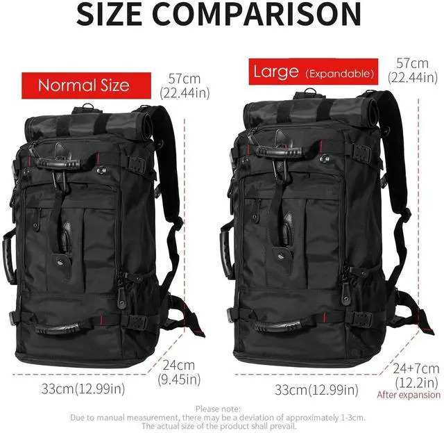 Large capacity design: Clothes, mobile phones, wallets, shoes, umbrellas, laptop, water cups, and other personal items can be put in. Separate laptop compartment. Large 60L and Normal size 45L fits in Hiking daily use Travel Airplane Carryon Camping has separate shoes bag. Extra Large65L) size has more storage space than Large size and can be used for Hiking Camping long-distance Travel or Winter Sports Snowboarding (larger shoes bag can fit in snowboarding shoes/helmet... ) ^^