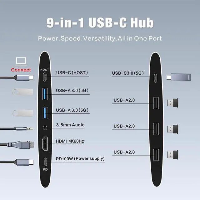 Its robust aluminum-alloy build, combined with a specially designed durable hinge, delivers exceptional long-term reliability ^^ What is in the packaging box? In the color box there is 1x laptop stand integrated with 9 ports USB-C Hub, 1x full-featured USB-C to USB-C cable (~ 19.7 inches long), 1x Instruction Manual ^^ Does it wobble or tip? This laptop stand compatible with MacBook Air is engineered for exceptional stability, securely holding your laptop in place. While we dont recommend typing directly on the elevated laptop, pairing it with a keyboard and mouse will significantly enhance your experience.