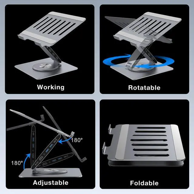 When adjusting the height of the stand, ensure the center of gravity is balanced. If the center of gravity is too off-center, the laptop may become unstable and tip over. Adjust the center of gravity properly, the laptop will sit securely on the stand ^^ Does 360-degree Swivel base turn smoothly and precisely? Unlike other laptop stand with 360-degree rotating base, this Compatible with MacBook Pro laptop stand features a rotation mechanism designed for precise positioning, it rotates smoothly and locks instantly upon release without the slight forward-or-backward oscillation ^^ Compact size and weightThis laptop stand with 4K HDMI docking station folds into a compact size of 11 8.9 1.88 inches (L W H) and weighs 2.23 lbs.