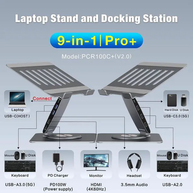 Is it compatible with my laptop? This laptop stand with docking station is designed for broad operating systems across MacOS, iPadOS, Windows and Android. Enjoy Plug-and-play with no drivers needed. Simply confirm your laptop has a FULL-FEATURED USB-C port by referencing the main product image or contacting us for confirmation before the purchase ^^ My laptop is big and heavy, does it fit? This sturdy aluminum laptop stand boasts reinforced build quality to prevent flex or sagging under heavy loads. With a 11x 8.9 -inch platform, it accommodates 15.6 -inch laptops and supports weights up to 18 lbs (ideal for large gaming/workstation models).