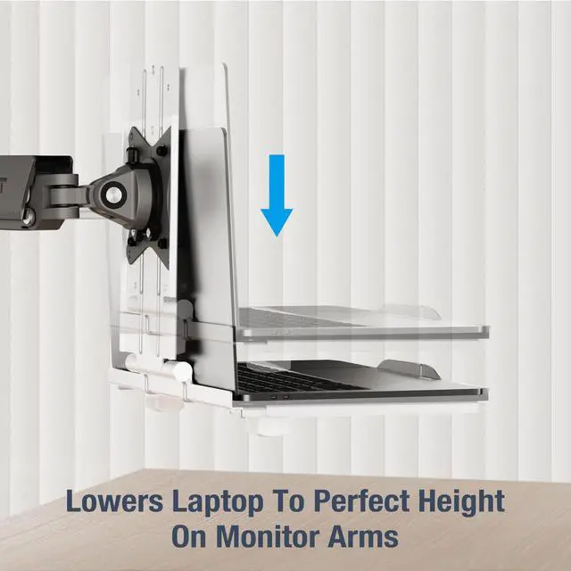 Height Adjustable: Set ideal laptop screen position; Mounts lower on monitor arms with VESA 75x75 mm pattern to achieve ergonomic viewing height; monitor arm not included.